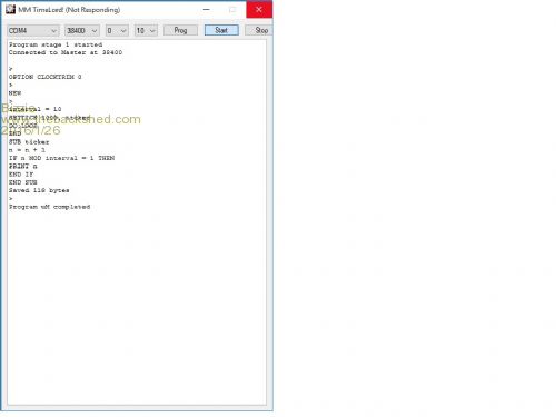 MMTimeLord loads a small program onto your micromite to send a short string to the PC every 10 (or whatever you set) seconds. The PC program times the incoming data to give a reasonably accurate indication of the micromites timekeeping ability. You can try different values for CLOCKTRIM and reload the program and try again. You can also set the interval for the timing data (default 10 seconds). This lets you run the system for long times and putting the micromite into a range of temperatures to see the changes. Set the com port, baud rate, CLOCKTRIM value and timing interval Click "Prog" to load the program onto the micromite - any existing program will be deleted. Start and Stop do what you would expect. If you change either CLOCKTRIM or Interval, you need to reload the program. If you try to run it on a micromite-plus which has a crystal, there will be an error when setting the CLOCKTRIM but it runs anyway. Each line of the printout is Computer time, last interval, average since start. 2016-01-26_045005_MMTimeLord.zip Earlier PC's did not have the high precision timer so this program will not function. I am not sure when it was introduced but I don't think anyone will run into the problem. Running high precision timers on a multitasking PC is a bit of a joke but I have been getting good results. I hope to have a Linux version running sometime soon. Jim VK7JH MMedit |
