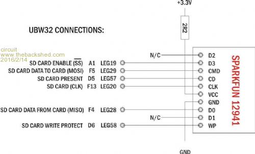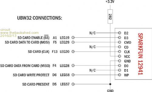 Grogster, thank you. Yes, my reference to "Leg" is to the arrangement of the connections on the periphery of the UBW32 board, not the PIC - and I have checked as far as I can and these do seem to correspond with the "CMM Pin numbers" that you quote. My problem lay, I think, in that there was no clear and obvious correspondence between the SD Card pin numbers and the arrangement of connections on the recommended SparkFun card. Now that I have (with everyone's kind help) brought myself up to speed with SD Card technology - which I have to admit complete ignorance of initially - I think that my final proposed diagram is, indeed, the correct interpretation. I will give it a go in hard wiring tomorrow.