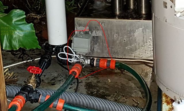 At this point now; motorised ball valve installed. Courtesy of Teenager on School holidays... It's 12V DC, polarity reversed to change direction. SPDT limit switch.