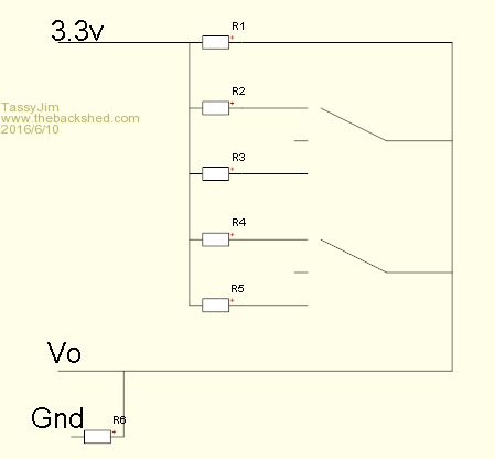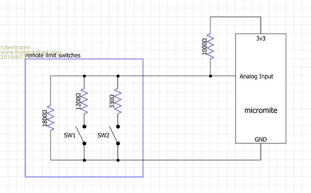 with both SW1 and SW2 open, about 2.1v will be present at the analog input, with SW1 closed there will be about 1.4v, with SW2 closed there will be about 0.7v. under fault conditions of the wiring from the micromite open-circuit there will be 3.3v at the analog input, while a short will result in 0v. these voltages are what the micromite 'believes' are present, and are independant of Vcc. no external reference or precise Vcc should be needed. the wiring 'cost' is a twisted pair to each valve, and 1 analog input pin per valve on the micromite. i would recommend against trying to encode more than a couple of switches per analog input. it is also a very good idea to have the motor travel shut down by a seperate set of contacts on the limit switches - i presume this is built into the motorized valve design? another safety feature is to monitor the motor current. the below spreadsheet contains the resistor value calculations: 2016-06-13_121906_resistor_values.zip cheers, rob :-) |