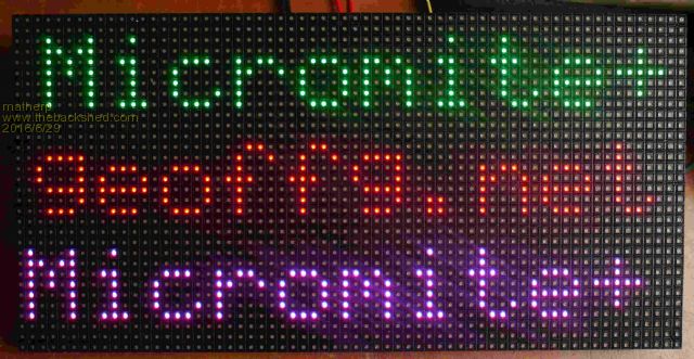 I've got a loadable driver for the 64x32 RGB LED displays like this one working (13x26cm). This needs 13 pins to drive the display and an external 4A 5V power supply to light all pixels in white. The driver allows you to use all the normal Micromite commands: BOX, TEXT, CLS etc. to drive the display and implements the background scanning transparently. The driver currently implements 8 colours i.e. 3 bits per pixel but I can expand this if I optimise the code. Let me know if this is interesting and I'll work to enhance the functionality. Current refresh rate is 62.5FPS on an MX170 Micromite so everyone except WW should find it reasonably flicker free