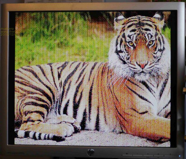 You can use 1A and 2A but not 1C. The firmware will give a "pin reserved" error if you try and use other channels You have realised that using VGA on the 64-pin means you can't use I2C as I2C and SPI4 share the clock pin and that is a fixed allocation. The only alternative is to lose SPI2 which means no SDcard. That is why I really only developed it for the 100-pin part Attached is a photo of our friendly tiger converted to RGB111 using XnView set to do 8-colour Bayer dithering displayed using the VGA driver. Loading the image takes just under 1 second. 2016-12-08_114326_tiger640.zip |