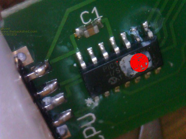 I wrote I am running out of mechanical options to explain the problem. At a first glance with just a magnifier I noticed discoloration near pin 8 and 9 and even microscope picture almost indicated a clear track hairline. Though that did not make sense because I assumed this was towards the LEDs. Closer inspection after a bit of cleanup shows liberal amount of solder but the crack was a valley in the solder throwing a shadow. I have since scraped the 'grey stuff' perhaps hotmelt something off the chip enough to just about decipher the pic16F1455-I/S(L?).