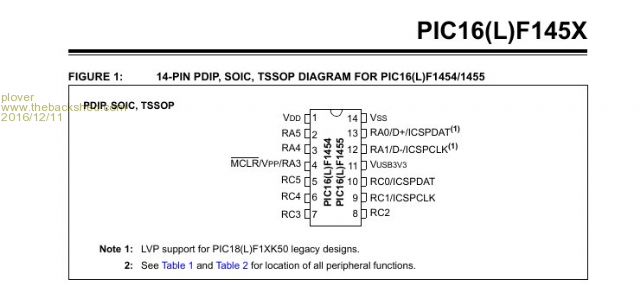Have downloaded the pic16F145X Data Sheet (418 pages food for the weekend) and flipped to section 26 USB, interesting stuff here which I can follow in theory but in practice I am stuffed at the moment. Did figure out that USB can be configured on pin 12 and 13. (Of course makes sense as the device have worked for over a week many hours a day, minor outages on and off until permanent crash)