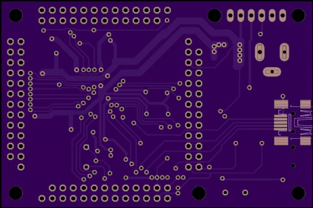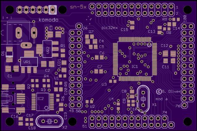 This is a small pcb for 100 pin /14mm pic32mx, it should be ok for pic24 and dsPic also. It might be described as a self-powered mcu board with pin connectors and usb and serial-usb ports. Practically all the mcu pins are brought out to the connectors. The regulator gets a little hot at 12 v but is ok for moderate currents. The power supply is under-designed, I had some surplus 20uF tantalum caps so I used those, most components are not critical. It is tested and works OK.