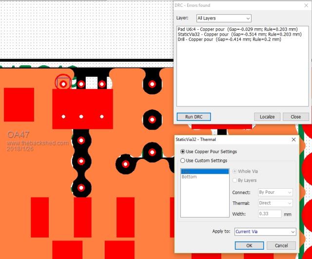 I have a double sided PCB in Diptrace and I am trying to link the ground pads of the 3T regs to the copper fill on the bottom of the PCB with vias for thermal purposes. Every time I try to achieve this I get errors in the DRC. Can anyone help with the right procedure to accomplish this?