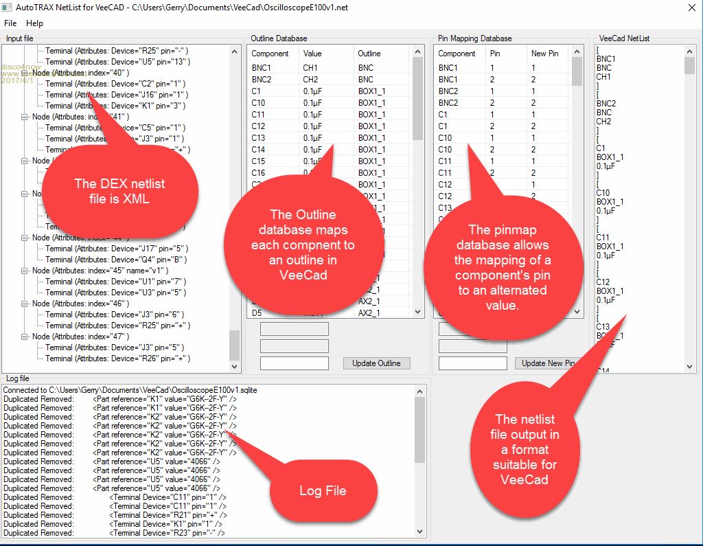 The netlists exported from AutoTRAX are not immediately in a format that can be imported into VeeCAD. The attached file contains a utility that converts the AutoTRAX netlists for use in VeeCAD and adds some useful features that allows mapping of the AutoTRAX components to suitable VeeCAD outlines and the mapping of AutoTRAX pin names to VeeCAD pins where required.