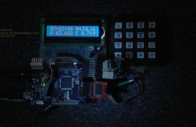 Connected up to the RTC, a small lcd and keypad with temporary cables etc, running solar position calculation once per second. Taken at dawn (just) in very dim midwinter light (in "shadow" of buildings, trees, clouds, etc) that the camera and browser do not handle well, sun approx. 0.7 degrees up but hidden. Azimuth 62.660 degrees from north changing to 62.662, Elevation 0.769 degrees from horizon. Plenty of connections still available but a bit congested. The RTC ( spi DS3234) has drifted approx. 7 seconds in 8 months, not bad at all. |