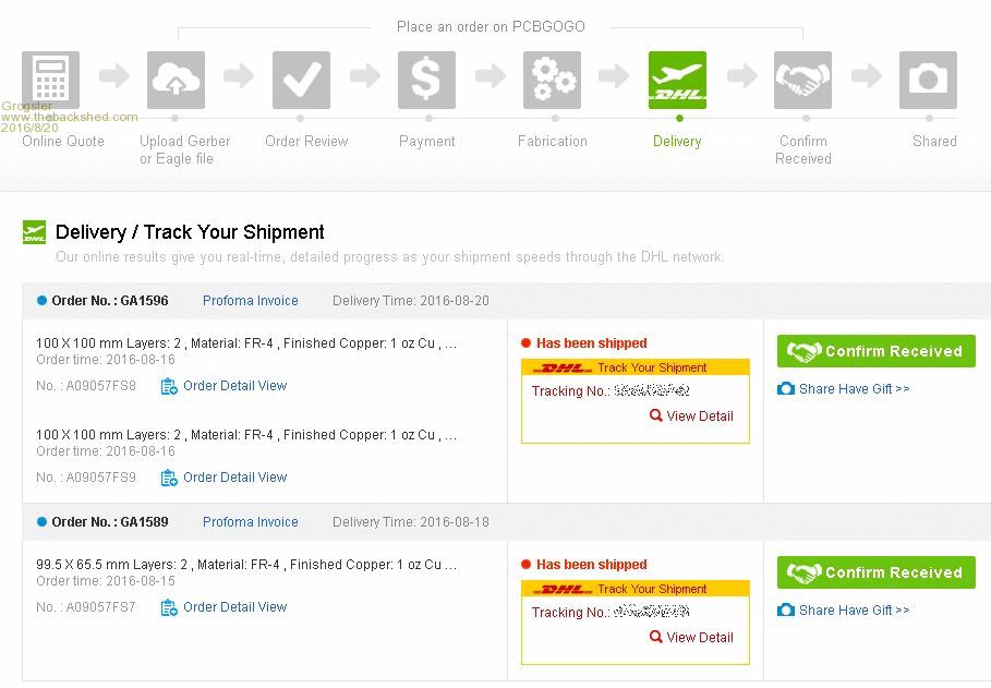 When DHL is used as the shipping option, turnaround from sending the files off, to getting the finished boards back is usually about seven working days, which is impressive. The closest turnaround time from another house I also use is two weeks landed here. PCB GOGO's website also gives you the DHL tracking numbers for your orders, and you just have to click the "View detail" hyperlink in the DHL box, and it will take you over to the DHL site and bring up the tracking information for you - dead easy, and you don't even have to copy-and-paste the tracking number.