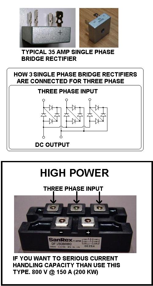 The only benefit from using bridge rectifiers instead of diodes is that it is simpler to wire. The drawback is that if only one diode burns out in the bridge rectifier, then the rectifier will cut your current flow by 50%. If you use 3 bridge rectifiers as shown in the arrangement below than your current carrying capacity becomes double. I would bring the three phase output of the F & P stator down the tower and rectify at the base.