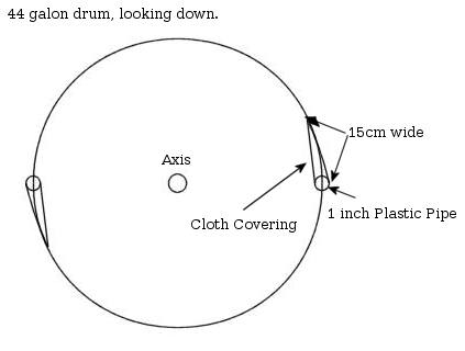 Great site, folks. How's this for an idea? Get a 44 gallon drum. Use a bit of string to mark out two 15cm wide vanes, spiraling symmetrically from the top of the drum on one side to the bottom of the drum on the other. Cut out the waste. Cut a single slit lengthwise down the side of some inch polypipe and slip this over the leading edge of each vane. Wrap cotton bandage tightly from the polypipe to the trailing edge of the steel vane. This will create a helical airfoil. Saturate the cotton with fibreglass resin. Find the centres of the drum top and bottom, whack on some bearings, do a bit of balancing, and Bob's your Auntie. Watcha reckon then? (The airfoil shape wouldn't be optimal but it might work. It would be better to glue some styrofoam to both sides of the vane and rasp it to shape, but this would take a bit longer. Another possibility would be to cut some styrofoam into 15cm wide strips, run them under a hot wire to get the shape and glue this onto the steel front and back.) |