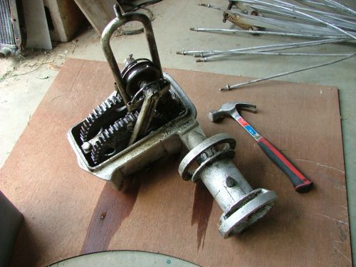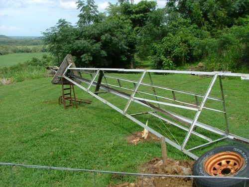 Here's a couple of pics I took yesterday. The tower, which is now in 3 parts beside the house I'm renting, and the "motor" as they like to call it, cover removed. The hammer is there for scale, I didn't hit anything I swear.