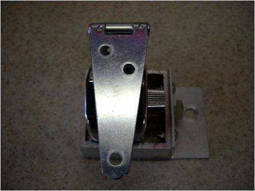 Building Update Sooner or later any self-respecting wind genny builder is going to need an accurate way to count coils of wire. For most of the crew, it can be done by hand, but when you build super small stuff like I do, the wire size gets rather tiny and you need lots of coil turns, more turns than you want to count by hand. To that end, I built myself an accurate coil-turn counter. As it turns out, I can also use it to very accurately measure my lathe's rpms. All I do is start my stop watch at the same time I start my lathe, with the counter engaged. I let it go for exactly one minute and shut things down, then glance at the counter and that's the rpms. Here we go: This is the finished toy and now I'll show you how I built it. That's a steel shutter hinge mounted on the back of the part that holds the little counter. As the cam from the winder comes by each revolution, it whacks the hinge, which clicks the counter and the numbers show in the little window. There's a knob to one side, which when twisted, resets the counter to 0000. Here's a side shot. The counter ($10 @ Staples) is pinched inside a 2" x 2" extruded-aluminum square tube I cut off a larger piece. A nylon 1/4 x 20 bolt holds it in place, wedged inside the square aluminum tube on three other sides. Here the whole contraption is mounted on my lathe bed ways. That large screw goes through to the underside of the ways and is held in place by a large bar that sandwiches everything each side of the lathe bed. Here's a tight shot of the little counter window sowing the numbers. That little knob to the right side is used to reset the counter to zero. Here's a shot of that bar underneath the lathe bed, which holds the counter tightly to the top of the lathe ways. This shows the counter, the long screw and the bar, which goes under the lathe bed for anyone who might be 3-D challenged!