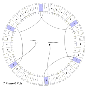 The Star connection is a common connection to all phases. I'll draw up more details in the next couple of days, but for now, If you used a common SP conversion, go for the new 7p2p conversion. A little tip, if you unwind the outer wire one turn, its long enough to reach the next pole ( 7 poles further around the stator ). We've done it, a cogless F&P windmill that starts in light winds with fast blades. Not only does it start easily, but output is improved because we arnt using reshaped pole ends or skewed magnets. Glenn The best time to plant a tree was twenty years ago, the second best time is right now. JAQ |