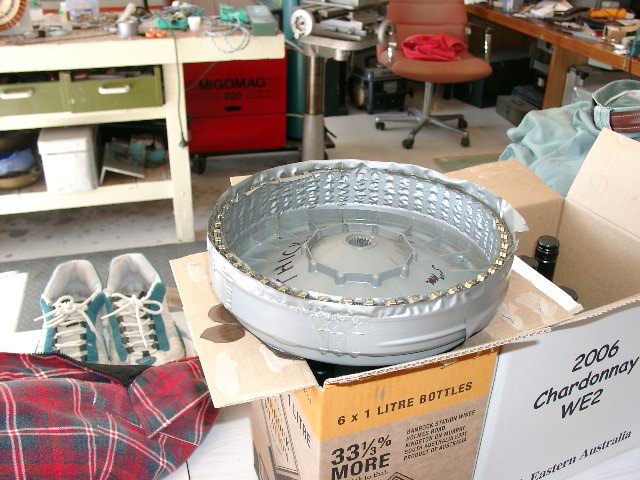 Sory guys ,the clothing is because it's for the brushcutting---the handbrake won't allow me to wear dirty grassy stuff inside ,so I have to strip off before racing to the shower---The booze, well before I found out about windmills,none of that was necessary,lol. PS. if you use "Gaffa" tape to form a dam before you pour resin --make sure it's the fibre cloth re-inforced stuff, my ordinary plastic stuff sort of melted and some resin spewed over the edges- oh well, shi# happens. Bruce Bushboy |