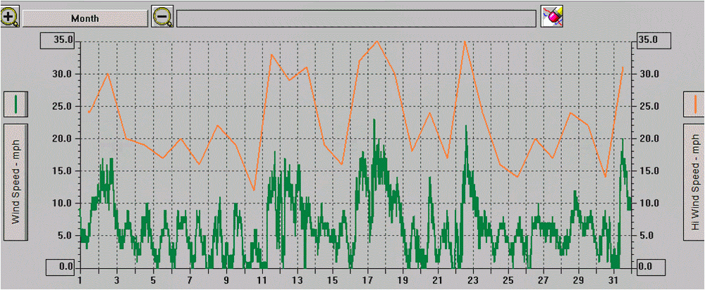 here is a months data of some typical wind at my home. Dark Green is 10min average, and the orange line is the daily maximums of recorded data within all of the 10min averaging periods within the day. Note the significant difference in the graphs