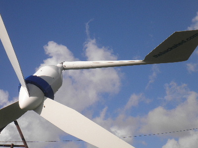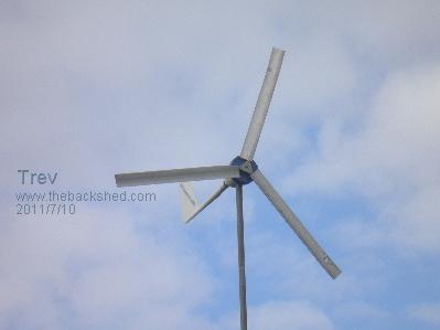All three steel bars were bent. Two blades were bent in the middle. All 3 blades were damaged where the steel bar goes in. The steel bar was bent and the guage on the press went up to 10 ton to straighten them. I tried the blade under the press but the thin trailing edge looked like it was just going to roll over so did not put much pressure on it. I hammered the bends in the blade. Cut them back to a length of 1600mm. So would be close on 3.4m diameter now. Re assembled in the hub with 3 bolts through blades and steel bar. The two blades that had the bends still have the bends in them and now with uneven spacing between blades, balance would not be right. To balance, I just ground the end off the blades appearing to be heavier. Refitted to White Pointer AXFX. The wind was blowing, but not real strong. We pulled up the tower and some rough weather had come in quite quickly. Note the change in sky colour. The wind had picked up and while we got the tower bolted in place (scary as I did not know how the blades would handle it), Dale (son) was watching the amp gauge - 30 amps! As soon as I could get to the gauge I saw 25 amps! I went for the wind speed guage. I measured up to 20km/hr, but I am sure the wind had dropped off some by then. There was quuite a lot of wind speed fluctuation and consequently amps too. I can't check wind speed and amps at the same time, so I don't really have any solid data. The best I had seen with wind up to 20km/hr was around the 14 amp mark with the 2.9m diameter fibreglass composite blades. The next morning the blades were still on. Back to quite wind and beutiful blue sky. Another lot of cloud came up quickly and the sun was shining on the White Pointer F&P single motor 2.5m machine and looked great with the dark sky background. So I took a photo of it too. On most days since, the AXFX may be doing 1-2 amps while the F&P 2.5 is sitting still. When the wind picks up and gets the F&P 2.5 running, they both do 1-2 amps each. When the wind speed ramps up the AXFX ramps up amps quickly and outstrips the F&P 2.5 easily. Trev @ drivebynature.com |