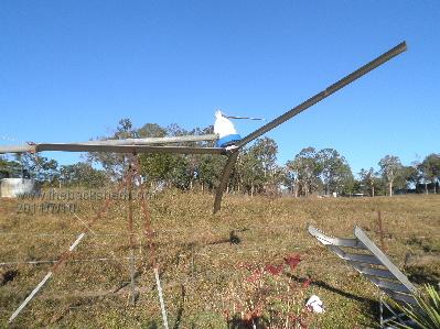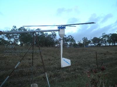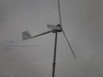 All is well here, cyclone Yasi is passed. A little more wind at times since yesterday afternoon. Some leaves and small branches were blown off. Nothing significant. We were not in direct path. AXFX (&F&P) was down for the potential blow. I just put the AXFX back up this afternoon. I have the 2.5m aerofoil blades on it and just did some measuring. Wind speed at ground level fluctuating between 8 & 15 km/hr while current fluctuating between 1-2 A at 48v battery nominal. It appears that these blades do not have enough torque for the AXFX. I did have the 2.9m composite blades on to start with. It furled too soon. I checked the weight difference between the old double F&P tail and the new one. I had to add about 150g to make them the same. I added 200g to the new one, so was then 50g heavier than the old one. It still furled too soon. I added angle to furl hinge, it is now 30 degrees of vertical. Normally set at 20 degrees. It then would hold OK but would get up speed and then turn out of the wind. The tail furl stop needs to be shorter (which I have done now with the 2.5m aerofoil blades) to allow the tail to have greater resistance to the blades wanting to turn out of the wind. With the 2.9m composite blades, it possibly would be better to have the tail longer too. I don’t know what the wind speed was, it was really up & down, but I have seen the AXFX with the 2.9m blades hit 12A, and then turn out of the wind. Here is a picture of the AXFX with the 2.5m aerofoil blades. The sky still is the results of cyclone Yasi. Trev @ drivebynature.com |