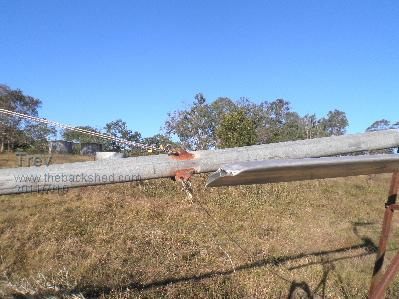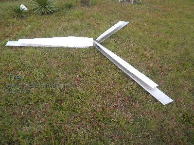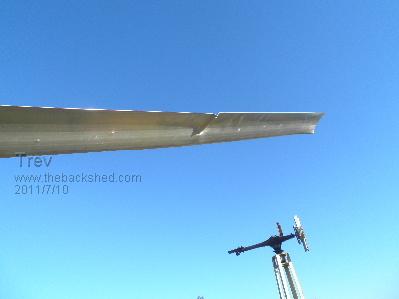 I always have the dream of making something easier. I bought some alloy aerofoil extrusion from Phil a long time ago. Thought it would be easier for blades (and cheaper too than my own fibreglass blades). They were 2200mm long, and with the hub, made a diameter of 4.6m. The idea is to catch the low wind, which is what I usually have here. The extrusions are easy enough to assemble. I fitted them up with mild steel 25mm about 300mm long into the hub I machine. I already had the hub made. It didn't take very long to fit the blades and hub together. Being so huge I could not check for balance. I was relying on the extrusions to be of equal length and distance, thus equal weight in each blade. Swapped the blades over on the White Pointer AXFX. They seemed a bit flexxy and thought they would not last. But oh well, it is a test so up we went. The blades started spinning before the tower was right up. Balance seemed ok. They seemed to spin at reasonably high speed, but did not get any real time to watch them. As the tower neared the top, the blades started hitting the welded brackets where the cables tie on. A big mistake! I should have had more bolts through the blades and steel bar. 1 bolt allowed the 2 outer skins to seperate allowing the blades tips to flex. The tower was up and straight back down. Trev @ drivebynature.com |