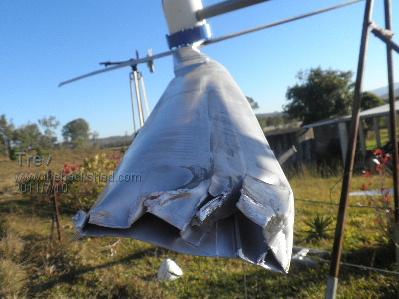 I have added 200mm to the length of the tail. The furl angle stop bolt adjusted to give greater resistance to the wind wanting to turn the blades out of the wind. It seems to track the wind better. Still no real output yet. Low wind. I am chasing some capacitors to use as a doubler. I want to try some caps before I consider making a new stator. Trev @ drivebynature.com |
