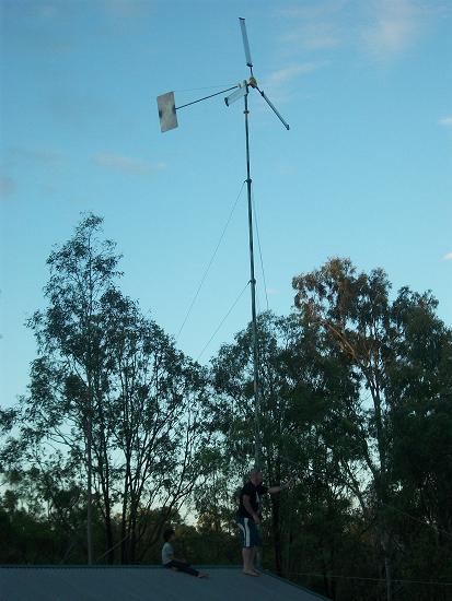 Hi Member Last year i brought a Phill Wind turbine and done a lot of modifications over the last few months including adding a 7metre long 75x75 RHS which has been lying on the ground for several years now. The tower is 13 metres high fitting with 6 guy cables and has been painted like army camouflage so my brown-nose local council dept wont see the tower i hope.