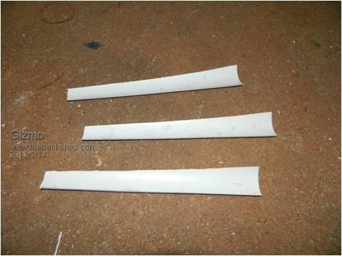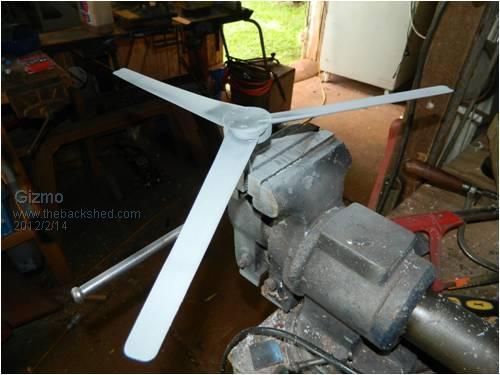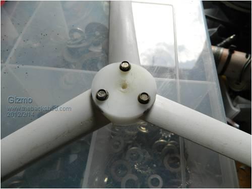 I made the hub from a little block of HDPE ( kitchen chopping board platic ). Its about 10mm thick, 15mm wide and 40mm long, with 3 holes drilled in it. The PVC blade was screwed to the outer 2 holes with self tapping screws, and the center hole is a pres fit over the little motor shaft.