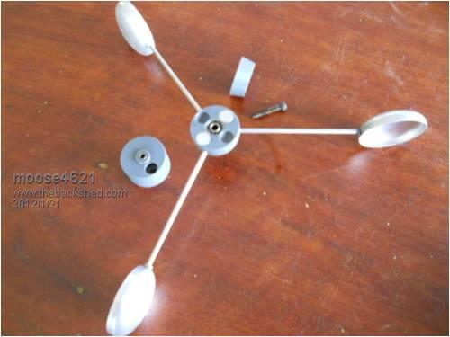 I am listening Glenn. Thanks for your input. I knocked up an anemometer this morning. It's body is machined from PVC bar stock, the arms from 3mm S/S and the cups pressed from 1mm aluminium sheet. Overall dia is around 300mm. The arms are drilled and tapped at 10 deg to aid in clearance. There are two 10 x 2mm neo's in the bottom of the rotor with recesses for two more if required. The base has been drilled to accomodate a hall effect device or reed switch. The cups were pressed using a punch and die I had already made for another project. It spins up at the drop of a hat and seems to do it's thing so now I need to work on the electrickery. A cordless sensor would be nice. He who dies with the most toys, wins! |