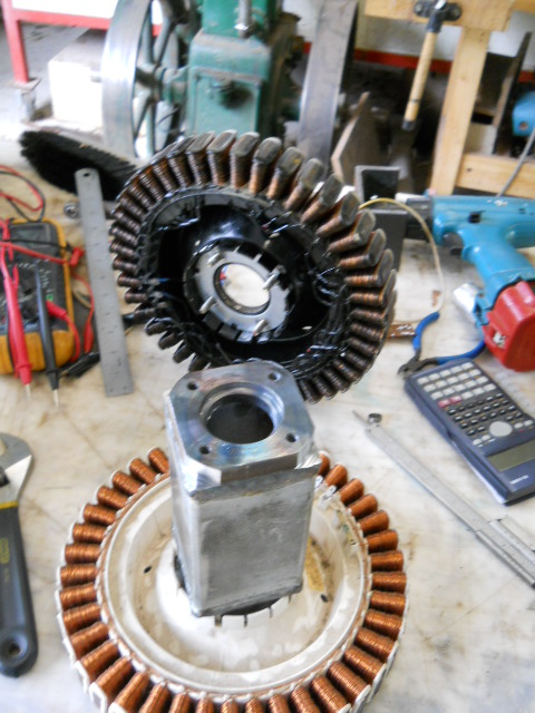 I've found a couple of round tuit's today so I started on the next mill. At this stage I am planning on a 60/80 dual with the 60 in delta and voltage doubler caps and the 80 in star with series and doubler caps, maybe. (Subject to change without notice). Has anyone rewound one of these stators with heavier wire? Anyway, plenty of time to think about that later. Hardware first. The bearing housing is 75 x 75 x 4 RHS with 75 x 16 flat bar at each end machined for 6005 bearing which protrudes the steel end plate and locates the stator as per washing machine. The corners of the 75 x 16 flat bar have been machined to allow the stator to fit. The shaft is simply a modified original from the washing machine with the bearing step removed and the spline on the agitator end extended to allow the second rotor to mate with it's stator and still have the original spline for the prop adapter. I've got to get the bearings before I go too much further as the next step is testing in the lathe for various configurations. (Why didn't I grab the bearings out of the washing machine? Good question)! He who dies with the most toys, wins! |
