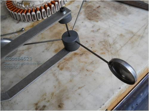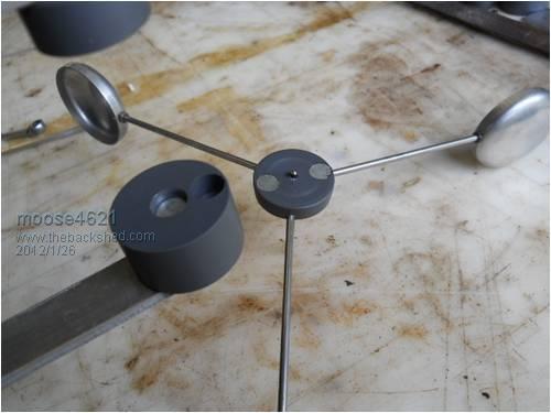 The spokes are 3mm stainless steel and the cups are 1mm alluminium sheet pressed into cups. My next improvement might be top use carbon fibre spokes and plastic cups to reduce the weight of the rotor assembly. I probably should replace the steel shcs's with nylon or s/s bolts too. Apart from that I think it's ready to go.