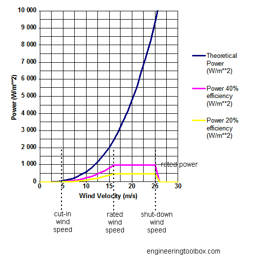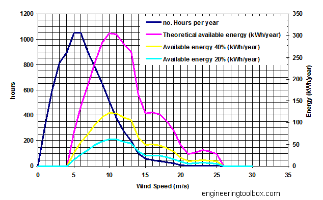 I should have posted this graph as well, it is a good illustration of how small the percentages of energy that is extracted from higher wind speeds are, you can see if the watts of potential energy are multiplied by the 24 meter rotor area, it becomes a huge number, even a tiny amount of lift in a very high wind will destroy a large turbine.