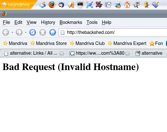 Just by accident typed in the URL without www. http://thebackshed.com/windmill/forum1/default.asp And got back this! Bad Request (Invalid Hostname) Whatever it is, Glenn, contrary to Gavins claims that everything is "perfectly valid", it is *NOT* working properly. I'm not planning any further diagnostics lest I step on any toes, nor am I going to say what is (or isn't) right, wrong or anything else save "it's broken" as other members have already reported. |