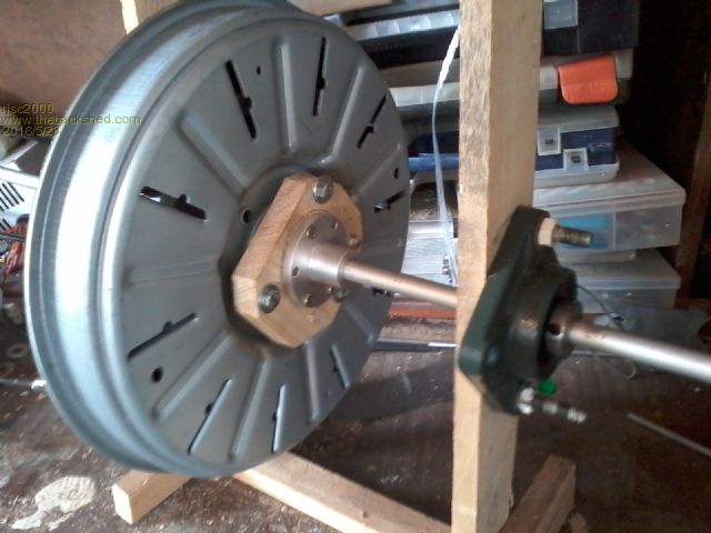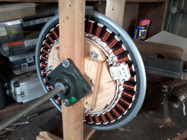 Hi I have started some time ago with a similar LG motor. Here is a photograph of an U-shaped box with two plumber block bearings carrying the shaft. The stator coils are attached to one face of the box and the shaft has a plate to which the magnet rotor is attached. The blades are home-made PVC cut from a blue PVC pipe. At this stage there is no tail yet!