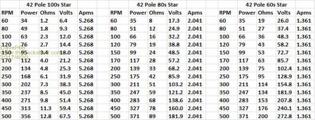For the same RPM the 42 pole stators output 40% less power for the same RPM as a 36 pole copper with black rotor cap shown in previous post.