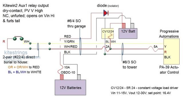 The control wire is long, but is really just an “ignition” signal to the actuator control operating through a dry-contact relay. With the “auto-return” function enabled and 12V+ present, the actuator travels to preset 2 (out, unfurled); with the 12V+ removed, it travels to preset 1 (in, furled). We’ve had some terrific winds lately. Sunday I started the turbine after breakfast and we logged just under 6 kWh by the time the wind died out around 7-8 PM. The PV array was .3 kWh for the day. We can live with this performance.