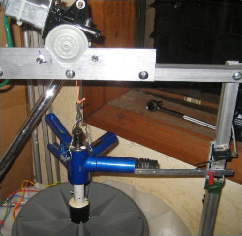 The winch is the little 12V window winder motor you can get from Oatly for $12. It has a 10mm shaft attached and uses a nylon cord as the cable. A stainless light cable would be better but it's just a prototype