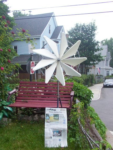I love this thing. Philippe from Boston send me photos of his windmill he made with " a bicycle wheel, 9 plastic coat hangers, Styrofoam and tape. " He uses a clothes dryer belt around the rim to turn a small motor. Its very clever the way he used the coat hangers.