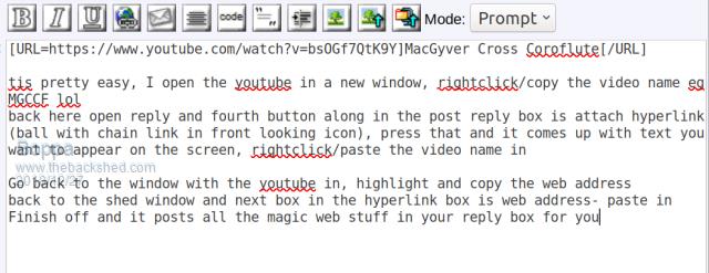MacGyver Cross Coroflute tis pretty easy, I open the youtube in a new tab, rightclick/copy the video name eg MGCCF lol -don't close that tab yet yet though back here open reply and fourth button along in the post reply box is attach hyperlink (ball with chain link in front looking icon-between U and an envelope), press that and it comes up with text you want to appear on the screen, rightclick/paste the video name in or just type what you want to appear on the post as the link name.... Go back to the window with the youtube in, highlight and copy the web address back to the shed window and next box in the hyperlink box is web address- paste in Finish off and it posts all the magic web stuff in your reply box for you It should look something like the top line in this... ![]() If you want to test it and see what it looks like, use the preview post button next to the post reply button... |