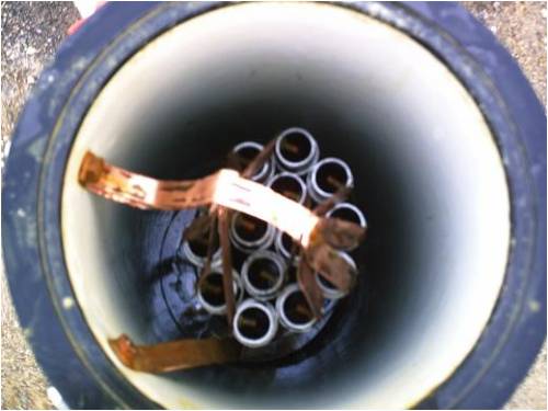 inside with about 1mm clearance between and 300mm long. I cut bits of conduit to space the inner and outer pipes which I placed near each end and the oxygen and hydrogen form between the pipes so gaps must be left. I made 14 lengths of pipe and bundled them together by cutting a length of 12mm copper pipe in half long ways and then flattened it out but next time I will use lead flashing and cut it in strips. I connected all the out side pipes to the positive terminal and all the inside pipes to the negative terminal and placed the pipes in tap water. The bubbles just pored out between the pipes so I added a little detergent to trap the escaping bubbles and ignited it. The result was amazing, it went off like a shot gun. I suggest just make up one length and put some jumper leads on the pipes in a bucket of water. To reduce resistance in the water just add baking soda and that will increase the current. This design is great if your going to feed the gas straight into the motor but to store hydrogen the oxygen must be removed, so I need to do a re-think on the design.