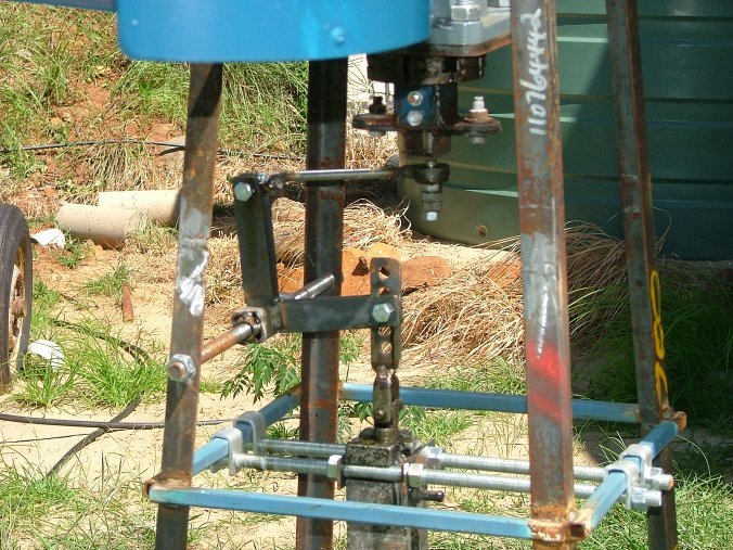 The home made piston pump was originally mounted horizontal, but was getting air pockets and not working too good, so I remounted it vertically and made a new linkage. Its now working much better, any air in the line is squeezed past the piston. It pumps about 100 litres a day, 12 meters up the hill to my header tank.