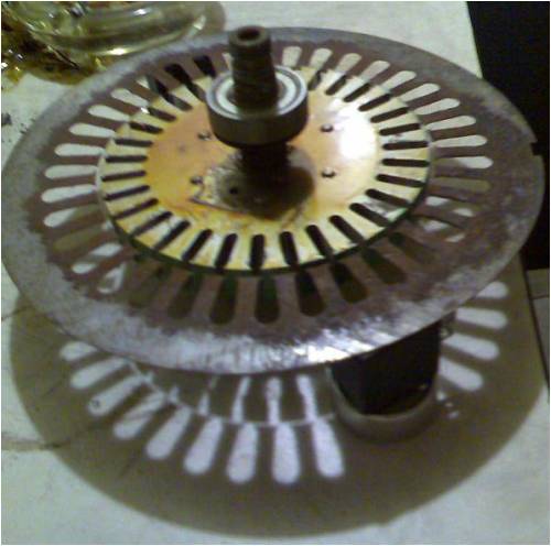 the air gap is 2mm between stator and rotor. I am not really happy with this large air gap, but it will have to do, as that is all I have got laying around. What I have noticed from playing around with my ceramic magnets, that if two alike poles (e.g. N/N) are sandwiched between a stack of laminations, magnetic "power" is increased to one end. So I think that the air gap should be okay with the "teeth" of the rotor enhancing magnetic magik towards the stator "teeth". I plan to use several more of these rotors with an alternate stacking of stator, rotor, stator rotor etcetera. I think 25 laminations from the stator will fit each rotor and once I have removed the copper wire from the rotor, I believe some nice magnets will fit in the slots. I am leaning towards plain neodymium magnets as i believe that heat will not be problem with the unit. Once I have raised some more rotors, I will then find a means of getting a shaft together to hold my multi-layered pancake assembly together. I might even use the shafts already attached...I have not got to that point yet. Cheers and have a good weekend http://cr4.globalspec.com/member?u=25757 http://www.instructables.com/member/OzzyRoo/ |