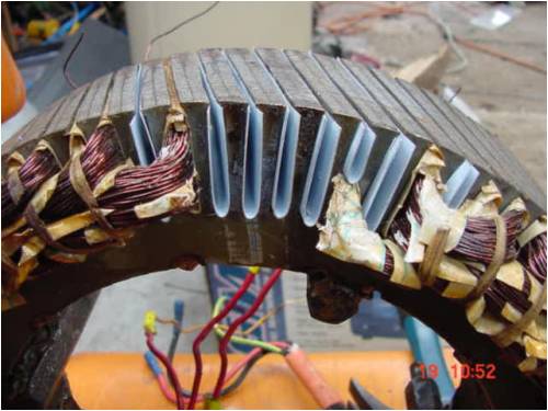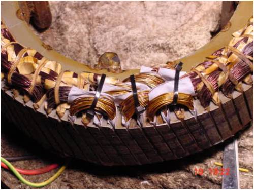 Sadly I forgot to get a pic of the coil itself. I needed 7 of them. 5 single coils, and 1 dual series coil. ie 2 coils wound 1 after another without cutting the wire between coils. We then place them into the stator and it looks like this