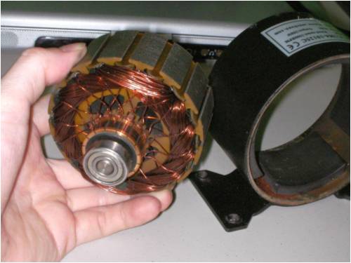 I've considered doing something else to it, turning it into an 'outrunner', where the rotor (the part you're holding in your hand) would become stationary and a new permanent-magnet (PM) rotor with neos would rotate. However, I've decided not to: the rotor has 16 teeth, so it 's practically impossible to rewind to 3-phase. But I digress. Back to your question: