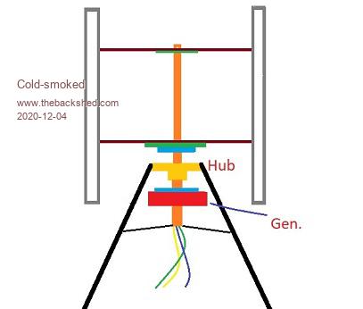 That looks very good. A very strong pyramid type of support structure is an excellent idea, and needed to support the whole thing against the high wind loading, and the inevitable vibration. The vertical rotating shaft could be extended right down to near ground level, and the main weight supporting bearing could be placed down low for best access. You could drive the generator direct through a coupling, but a better idea might be to drive it through a belt or a chain drive, with a drive ratio that could be very easily altered, especially if the generator was bolted to slides to easily adjust the centre distance. There may be some very great gains to be had with an an adjustable drive ratio. If its all kept very simple, with the fewest parts, its not only going to be easier to fabricate initially, but also a lot easier to rebuild if it ever gets wrecked in a storm. Cheers, Tony. |