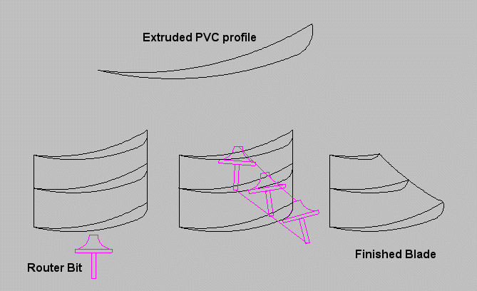 Hi Guys I've been in contact with Wes LeMarr, who some of you may remember posted a message a few days ago looking for advise on a windmill design he hopes to bring to market. Wes has factories in Germany, China and the USA. Wes called me from the USA last night and we had a chat about blade options for his windmill. I told Wes the standard fibreglass blades supplied with those cheap Chinese windmills let the rest of the machine down, and he should strive to come up with a better blade design to include with his windmill, and of interrest to us, sell seperately to the home built windmill market. The blades would be manufactured at the factory in China, where they have access to a PVC extrusion machine and router. Making a new die for the PVC extrusion is not a problem. What does this mean? It means we have the opportunity here and now to design a new blade profile for mass production. The blades will be PVC, and any length from under 1 meter to over 2 meters ( a 4 meter turbine or bigger ). Because they are extrusion made blades, there is no twist or taper, just like those fibreglass chinese blades, however Wes's factory has access to cnc router equipment that can cut the blades to the correct taper. By putting our heads together we should be able to come up with a extrusion shape that can be routered to give the best taper and twist/angle. Hopefully the picture below will explain what I'm trying to say. The top profile is the end view of the extrusion. Bottom left is the blade with 3 stations shown, top side facing the wind, and a concave router tip. The router concave is the same radius as the leading edge of our blade. By routing a line down the length of the blade, as shown in the middle bottom image, we end up with a finished blade, shown bottom right. This is a very cheap way of mass producing blades, and this will reflect in their price. What do you think? Is there another way we can use an extruded length of PVC of any shape we desire to produce a good blade? What do we get out of helping Wes? We get a better option that the straight fibreglass blades currently on the market, in more sizes, and possibly for less cost. It also means Wes can get his windmill to market with a better set of blades, and thats got to be a good thing. Glenn