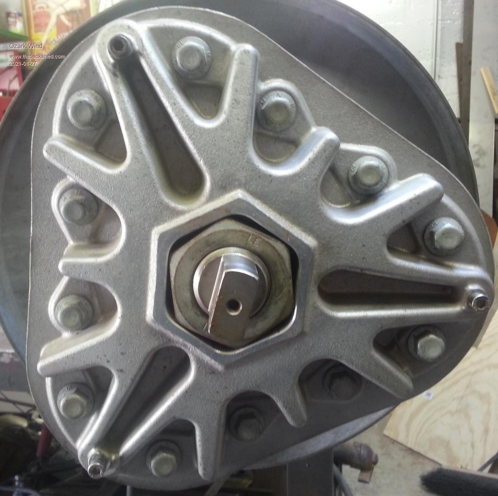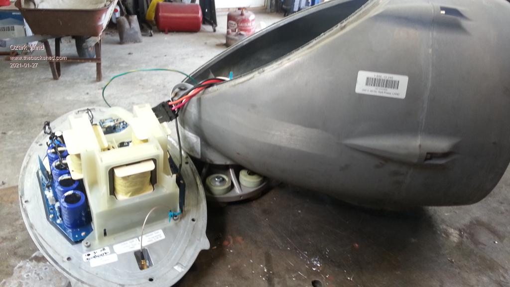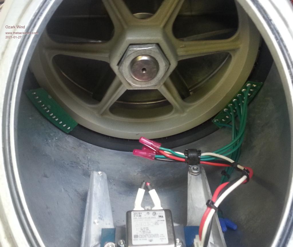 After some thought I decided to gut or remove all the electronics from the mill thinking that I will fly the Skystream with a ground based control system. The mill itself is in VERY good condition its housing is made of aluminum with large Japanese bearings, fiberglass curved blades, slot less neo magnets etc. I connected my volt meter to the PMA and spun the input shaft it does put out power. The mill is basically new or barely used.