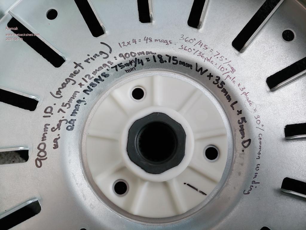 Stock Samsung P/N: 09CA49132 Stator 900mm ID. Mag ring 75mm W x 35mm L x 5mm Thk mag bricks 12 mag bricks 4 poles per mag brick NSNS 75mm/4 = 18.75mm W magnets 35mm L x 18.75mm W x 5mm Thk per mag pole 48 mag poles @ 7.5deg per pole, 15deg per "like" polarity Stock mag flux density = approx 1750/1800 Gauss 36 coil poles = 360deg/36 = 10deg per coil pole 3 phase winding XYZ = 30deg per "common" phase winding 15deg per mag pole of "like" magnet polarity 30deg per "common" phase winding therefore the "like" magnetic pole polarities (and transitions thereof) will always aline with the "common" coil windings throughout rotation, as 15deg is an even common denominator of 30deg. ![]() ![]() Edited 2021-04-19 06:08 by Kamak |