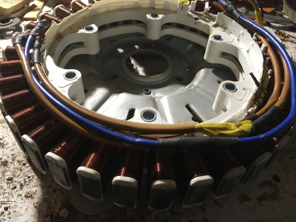 I can see what looks like a 'star point' on the right side in the picture, so if I've understood how it was originally wired:- 3 phases wired star, each with 12 coils series connected. You have modified each phase to 3parallel x 4series coils? If so i can't see how the reconfigured phases connect to the original star point - I'm thinking there ought to be another 2 star points or 9 wires going to a single star point.