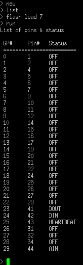 Print "List of pins & status" Print Print " GP#"," Pin#","Status" Print " ========================" Print 0, MM.Info(PINNO GP00),MM.Info(PIN MM.Info(PINNO GP00)) Print 1, MM.Info(PINNO GP01),MM.Info(PIN MM.Info(PINNO GP01)) Print 2, MM.Info(PINNO GP02),MM.Info(PIN MM.Info(PINNO GP02)) Print 3, MM.Info(PINNO GP03),MM.Info(PIN MM.Info(PINNO GP03)) Print 4, MM.Info(PINNO GP04),MM.Info(PIN MM.Info(PINNO GP04)) Print 5, MM.Info(PINNO GP05),MM.Info(PIN MM.Info(PINNO GP05)) Print 6, MM.Info(PINNO GP06),MM.Info(PIN MM.Info(PINNO GP06)) Print 7, MM.Info(PINNO GP07),MM.Info(PIN MM.Info(PINNO GP07)) Print 8, MM.Info(PINNO GP08),MM.Info(PIN MM.Info(PINNO GP08)) Print 9, MM.Info(PINNO GP09),MM.Info(PIN MM.Info(PINNO GP09)) Print 10, MM.Info(PINNO GP10),MM.Info(PIN MM.Info(PINNO GP10)) Print 11, MM.Info(PINNO GP11),MM.Info(PIN MM.Info(PINNO GP11)) Print 12, MM.Info(PINNO GP12),MM.Info(PIN MM.Info(PINNO GP12)) Print 13, MM.Info(PINNO GP13),MM.Info(PIN MM.Info(PINNO GP13)) Print 14, MM.Info(PINNO GP14),MM.Info(PIN MM.Info(PINNO GP14)) Print 15, MM.Info(PINNO GP15),MM.Info(PIN MM.Info(PINNO GP15)) Print 16, MM.Info(PINNO GP16),MM.Info(PIN MM.Info(PINNO GP16)) Print 17, MM.Info(PINNO GP17),MM.Info(PIN MM.Info(PINNO GP17)) Print 18, MM.Info(PINNO GP18),MM.Info(PIN MM.Info(PINNO GP18)) Print 19, MM.Info(PINNO GP19),MM.Info(PIN MM.Info(PINNO GP19)) Print 20, MM.Info(PINNO GP20),MM.Info(PIN MM.Info(PINNO GP20)) Print 21, MM.Info(PINNO GP21),MM.Info(PIN MM.Info(PINNO GP21)) Print 22, MM.Info(PINNO GP22),MM.Info(PIN MM.Info(PINNO GP22)) Print 23, MM.Info(PINNO GP23),MM.Info(PIN MM.Info(PINNO GP23)) Print 24, MM.Info(PINNO GP24),MM.Info(PIN MM.Info(PINNO GP24)) Print 25, MM.Info(PINNO GP25),MM.Info(PIN MM.Info(PINNO GP25)) Print 26, MM.Info(PINNO GP26),MM.Info(PIN MM.Info(PINNO GP26)) Print 27, MM.Info(PINNO GP27),MM.Info(PIN MM.Info(PINNO GP27)) Print 28, MM.Info(PINNO GP28),MM.Info(PIN MM.Info(PINNO GP28)) Print 29, MM.Info(PINNO GP29),MM.Info(PIN MM.Info(PINNO GP29))