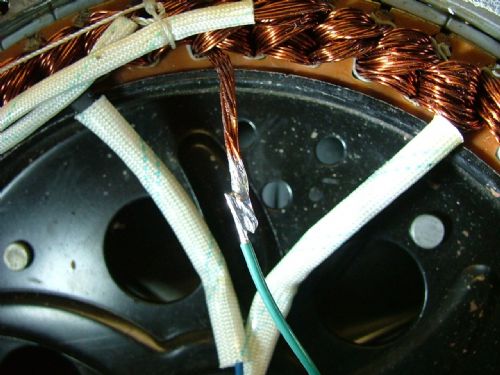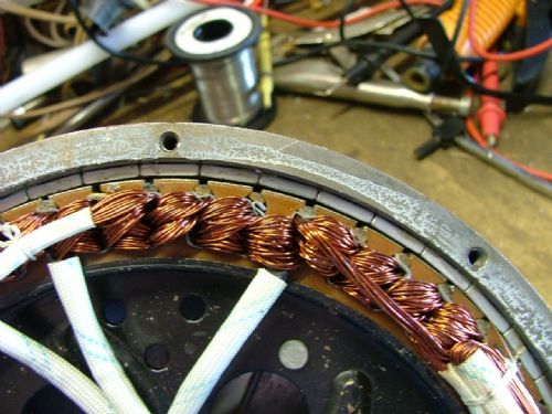 Just for interests sake. I have a 300 watt hub motor from China. These are very well made, though there are a couple of area's that need attention before they could be used on a windmill. The first concern is the shaft. Its 15mm at its widest point, with a 7mm hole down the middle for the wires to pass through. On a push bike where the motor is supported at both ends of the shaft, this would be sufficient. But for a windmill where its only held at one end, it would break easily of the turbine was out of balance or there was a sudden wind direction change. It would be easy enough to strengthen, with a new shaft or a sleeve and bigger bearing. The other problem I've noticed is the lead out wires. The coils are wound multi strand, 8 of 0.6mm copper enameled wire strands bundled together to give a diameter of about 2.5mm, but the lead out wires measure only 1.2mm diameter copper, thats a big step down in cross section, and a big reduction in the current handling capability of this thing either as a motor or alternator. The easy fix is to mount the rectifiers inside the alternator, connect the -ve to the shaft and feed a single 4 or 5mm copper wire through the 7mm hole as the +ve. There is no noticeable cogging, and its easy to turn my hand. Here's a few photos.