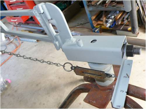 Because I already have built my tails and dont really understand all the sin, cos , tan , stuff I decided to use a spring scale and alter the angle of the tail pivot untill I reached the 4 - 5 Kg , and as I can change the blade offset from 0 to 200mm it would be the 1/2 way mark if I wanted to increase or decrease the furling moment . The pics below show how I set all this up using a piece of string to act as the resistance on the tail tip ( the wind) and the spring scale pulling at the point of the rotor centre .